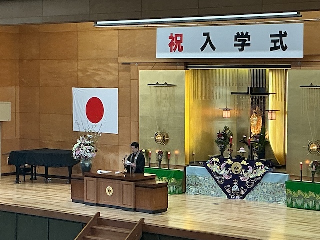入学式では校長先生より、本校の歴史と建学の精神について述べられました。本校は明治11年創設の伝統校であり、浄土真宗の教えに基づく「心の教育」を大切にし、「合掌・感謝・自律・明朗」を校訓として教育活動を行っています。日々の学校生活を通して、「おかげさま」「ありがとう」という感謝の心を育み、人としての成長を目指していくことの大切さが伝えられました。