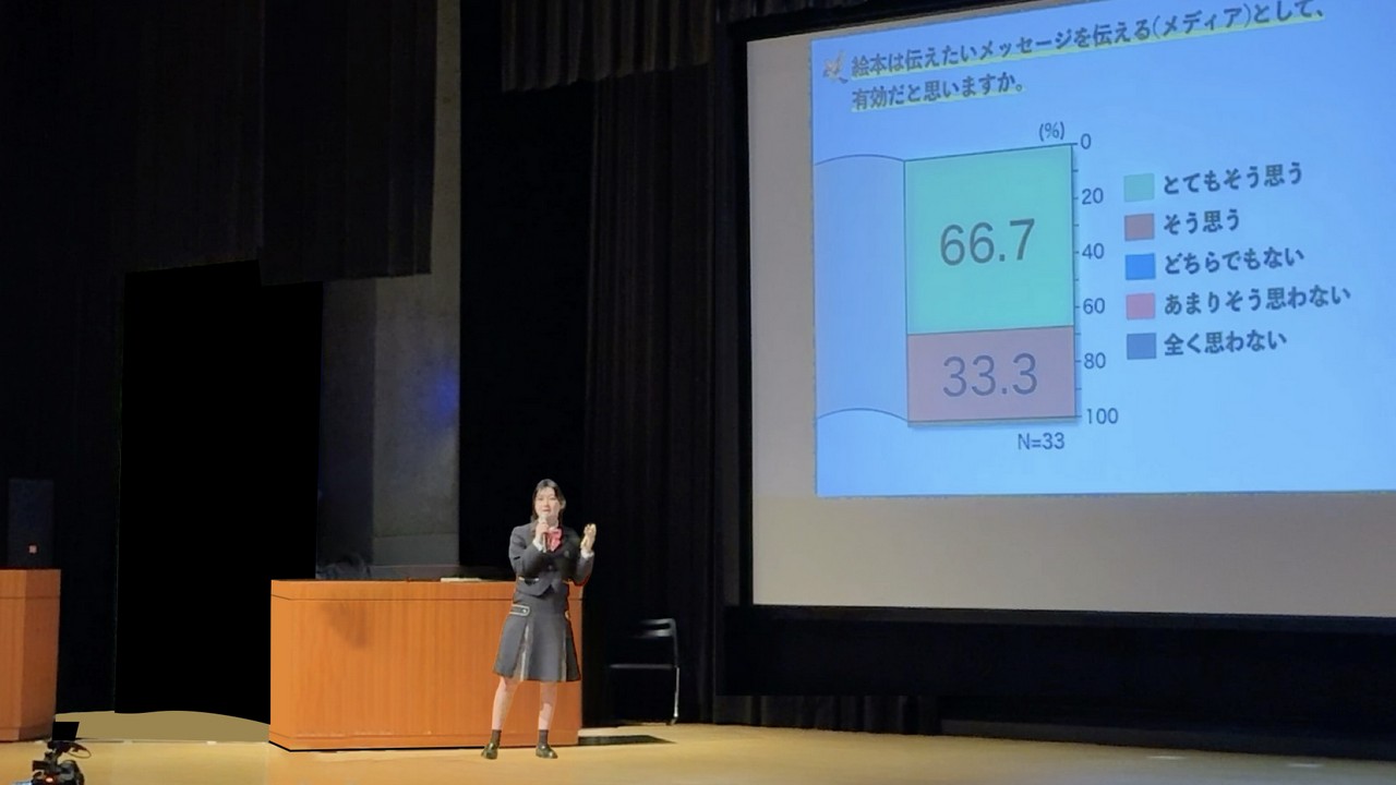 絵本のイラストや表現方法が時代と共に変化していることに気づいたことをきっかけとして、絵本のもつ「伝える力」を社会課題の解決に役立てられないだろうかという探究学習に取り組んだことを発表しました。社会課題に関心をもつための工夫を「舌切り雀」をモチーフにした絵本を制作し、その効果を検証するなど、探究学習のプロセスをしっかりと踏まえた実践でした。発表では演題の前に立ち、原稿などを見ることなく、自分の言葉でプレゼンテーションすることができました。